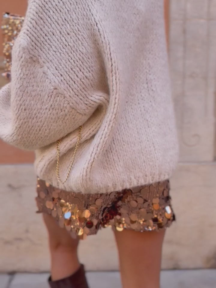 - These sequined shorts blend avant-garde design with dazzling glamour, featuring meticulously arranged sequins that create a mesmerizing sheen under light. The clean lines and tailored cut showcase a modern silhouette.