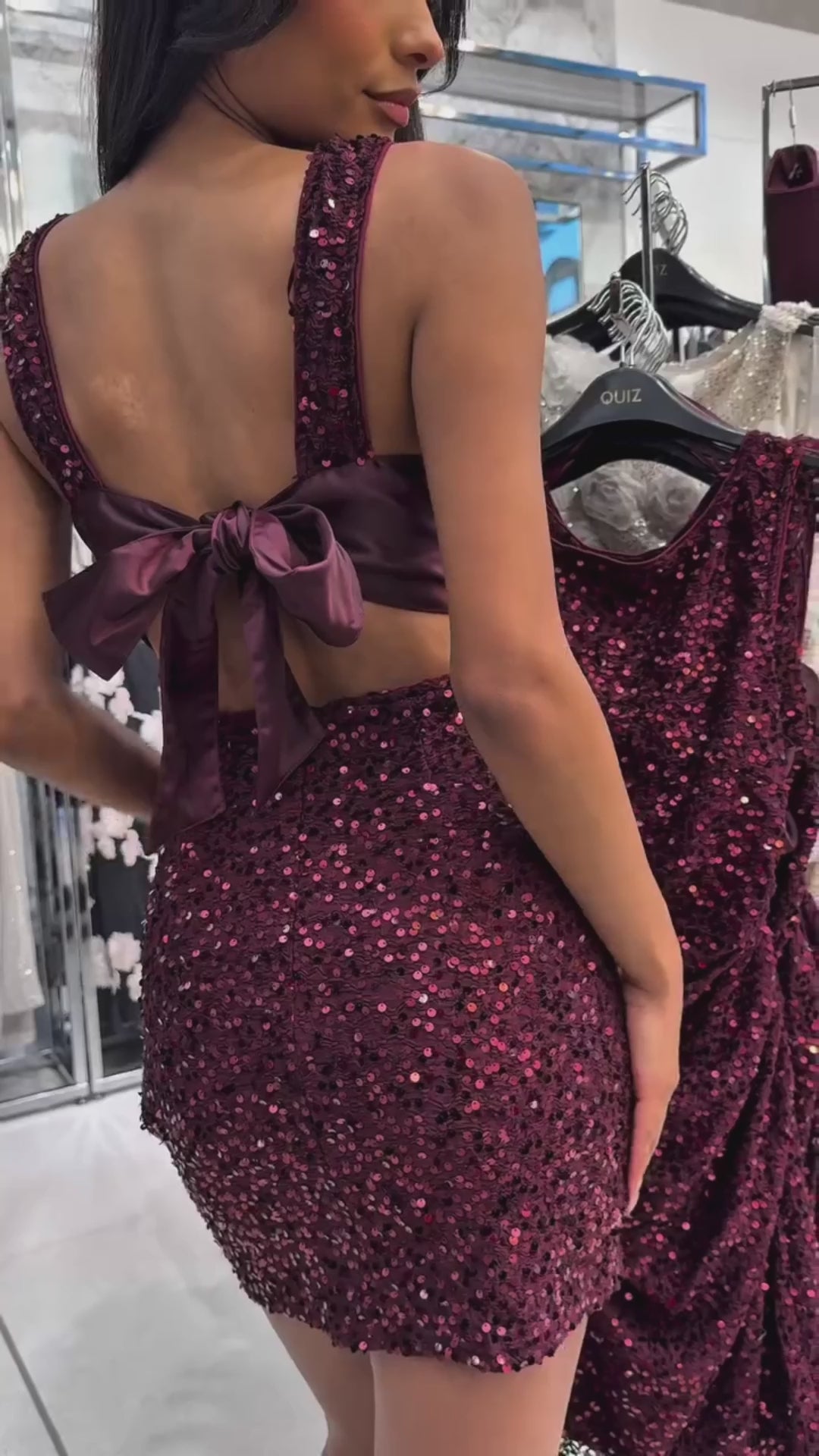 - This dazzling sequined mini dress embraces a bold and sophisticated style, effortlessly elevating your evening look. The shimmering sequin details sparkle under the light. The daring open back design exudes modern confidence.