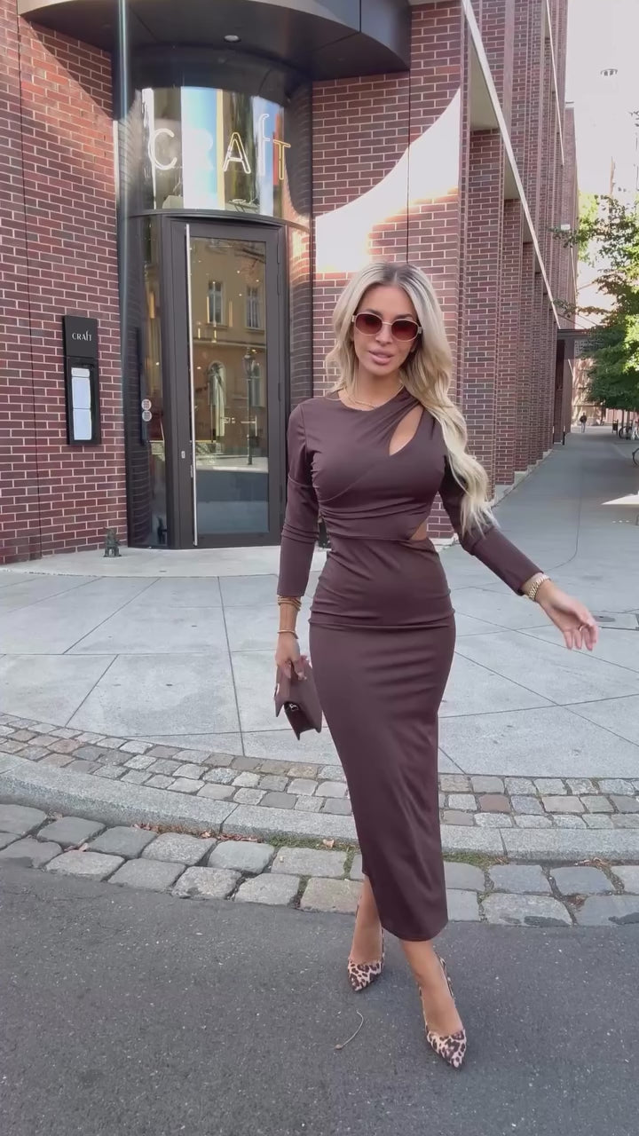 - This fitted Midi dress blends modern fashion elements, with delicate openwork design adding visual depth, long sleeves providing elegant coverage, and a slit hem showcasing dynamism and charm. The close-fitting cut accentuates the figure's curves.